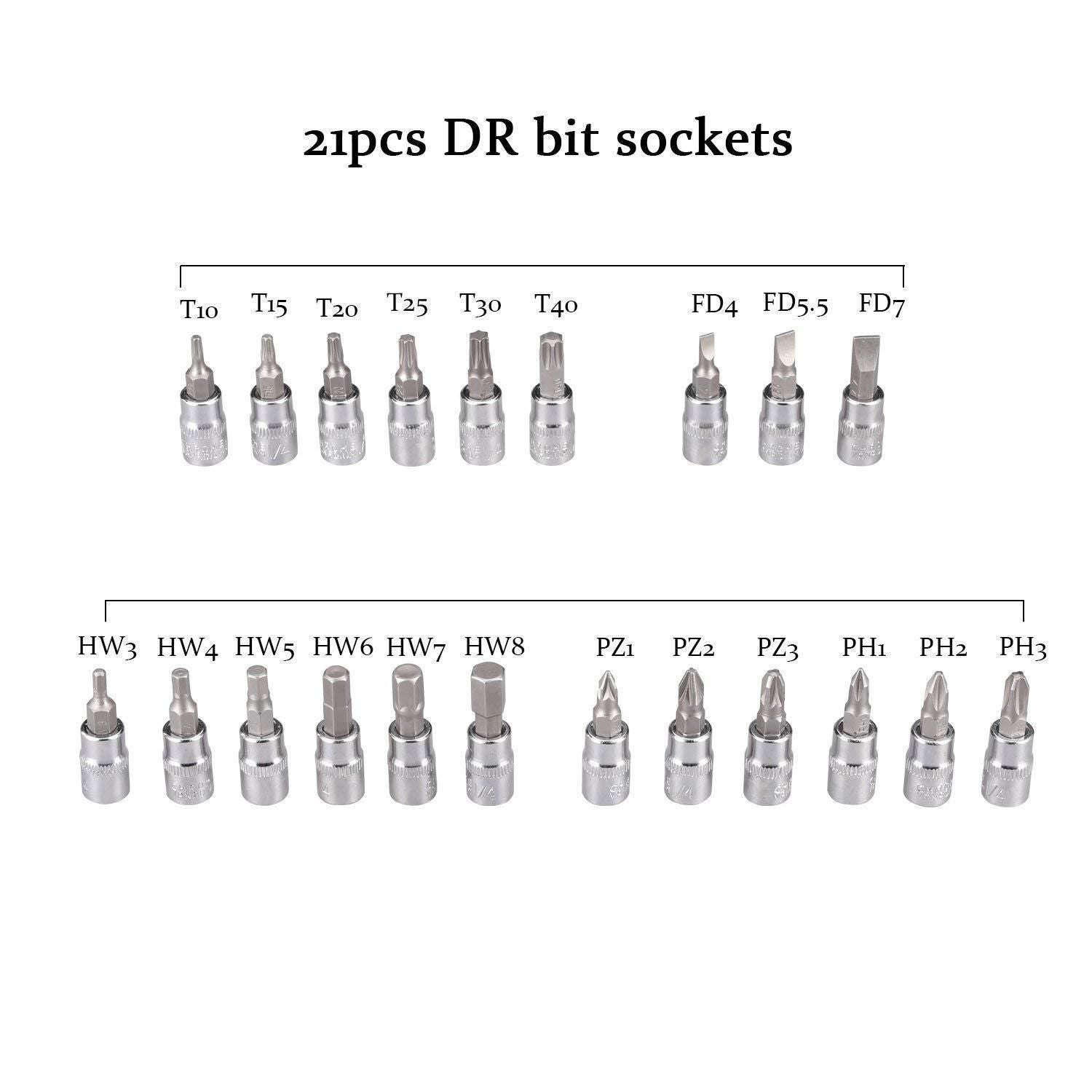 Description: It Has 1 Piece of Combination Socket Wrench Tool Kit Package Contains: It has 46pcs hand tools, combination, wrenches, sockets, ratchet, vehicle maintenance and repair tools 1. Has 13pcs 1/4 inches dr sockets: 4, 4.5, 5, 5.5, 6, 7, 8, 9, 10, 11, 12, 13, 14mm 2. Has 21pcs dr bit sockets: ph 1, 2, 3, * Pz 1, 2, 3, * fd 4, 5.5, 7 * hw 3, 4, 5, 6, 7, 8, * t 10, 15, 20 , 25, 30, 40 3. Has 2pcs 1/4 inches dr extension bars 4. 1pcs 1/4 inches dr quick ratchet 5. 3pcs hex key wrenches: 1.5, 2, 2.5mm 6. 1pcs 1/4 inches dr universal joint 7. 1pcs 1/4 inches dr sliding bar 8. 1pcs 1/4 inches dr flexible extension 9. 1pcs 1/4 inches dr spinner handle 10. 1pcs bit adaptor 11. 1pcs bit adaptor 1pcs blow case1pcs blow case Material: Stainless Steel Item Weight: 1000 gm Packaging Dimension ( L x B x H in cm ) : 25 x 14 x 5 Useful For: It Can Be Used for Bike and Car wheels.